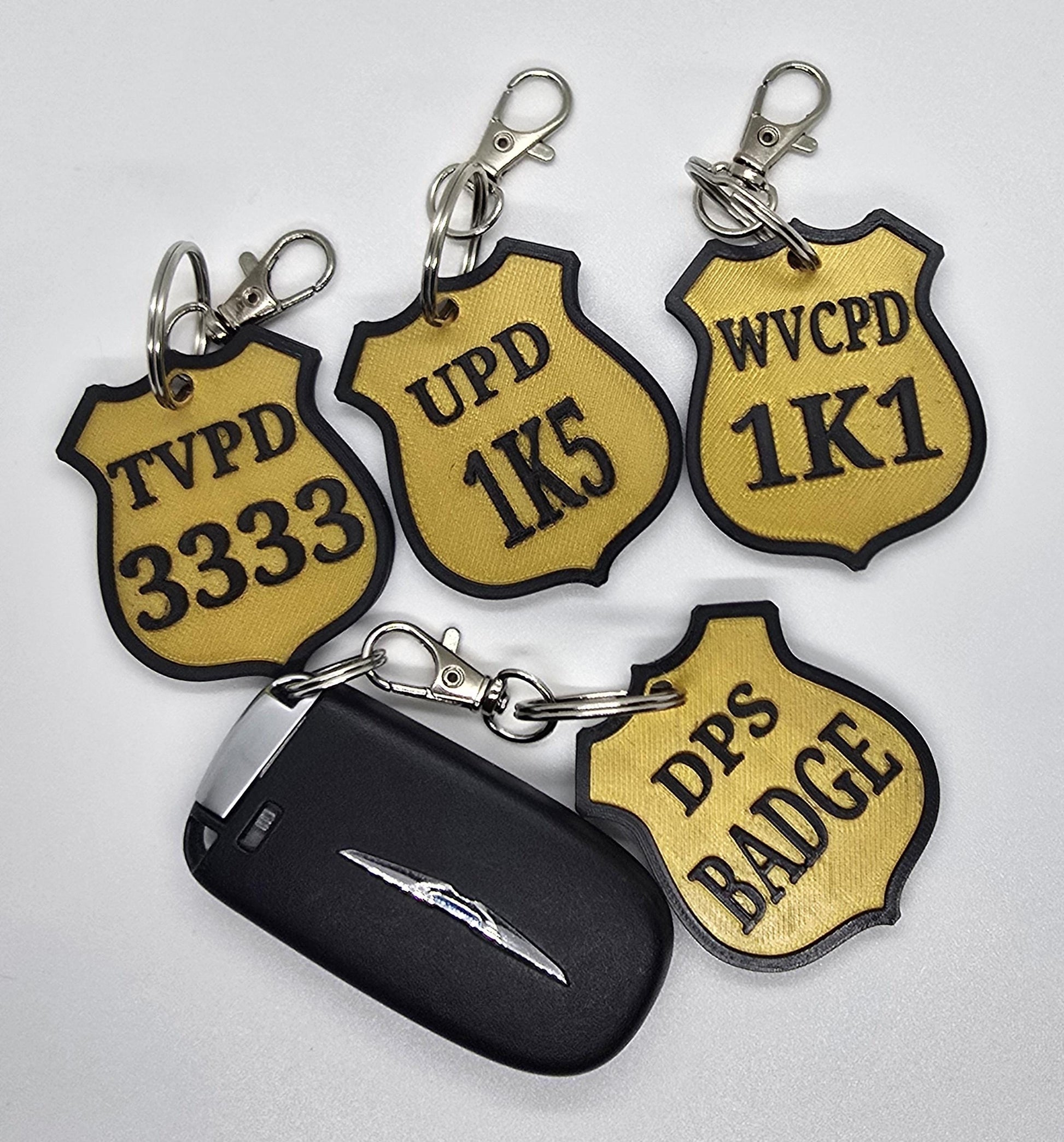 This is a cool 3D printed police badge style keychain. This is made out of strong PETG HF filament to ensure it does not deform or melt, staying strong and sturdy for years to come.