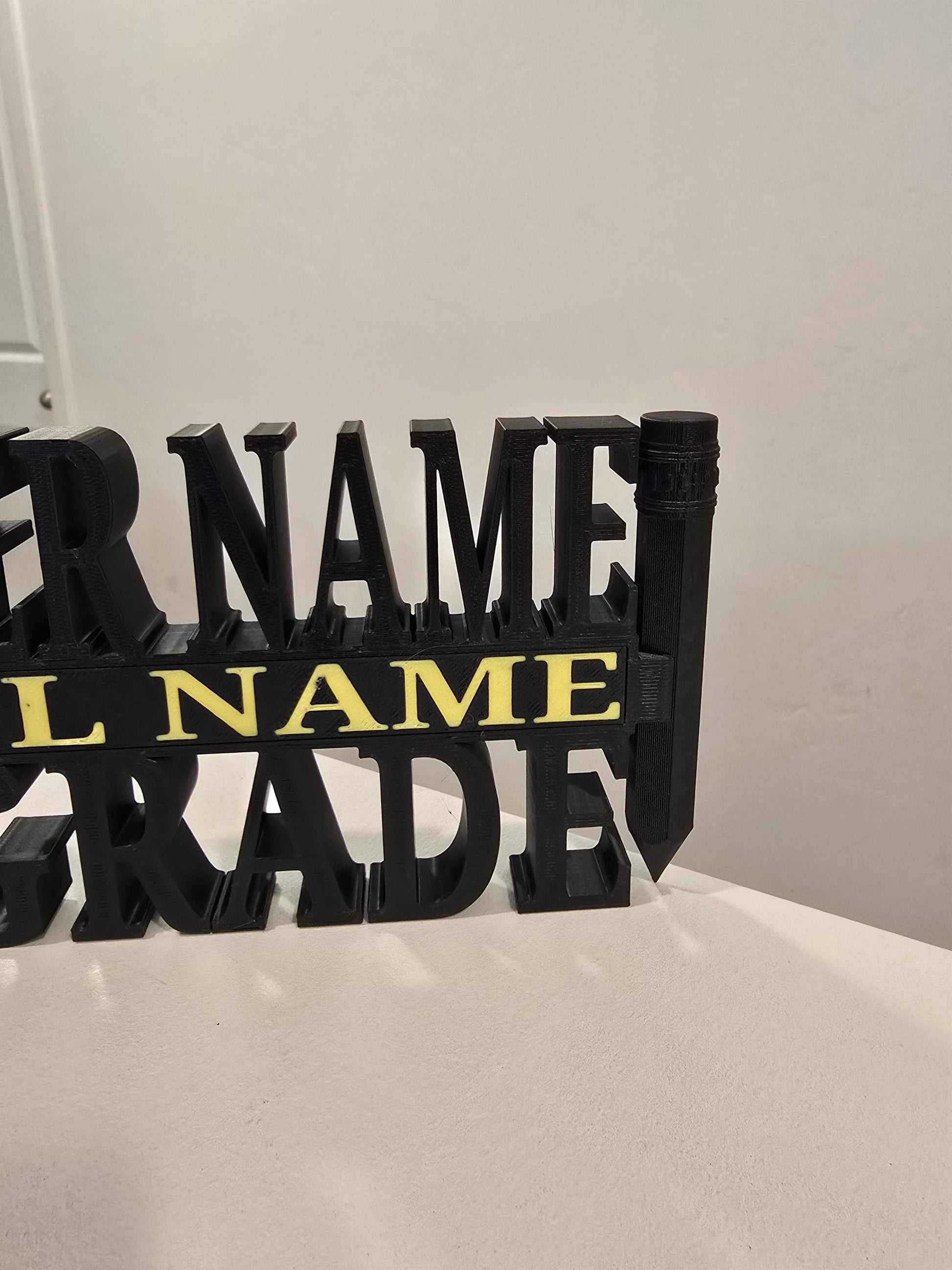 This design has a cool pencil attached to the name plate, special just for teachers!!! We are able to do any custom name, grade, and school name you would like. We will customize the text, create it, permanently secure everything together (name plate and school name insert), and ship it out.