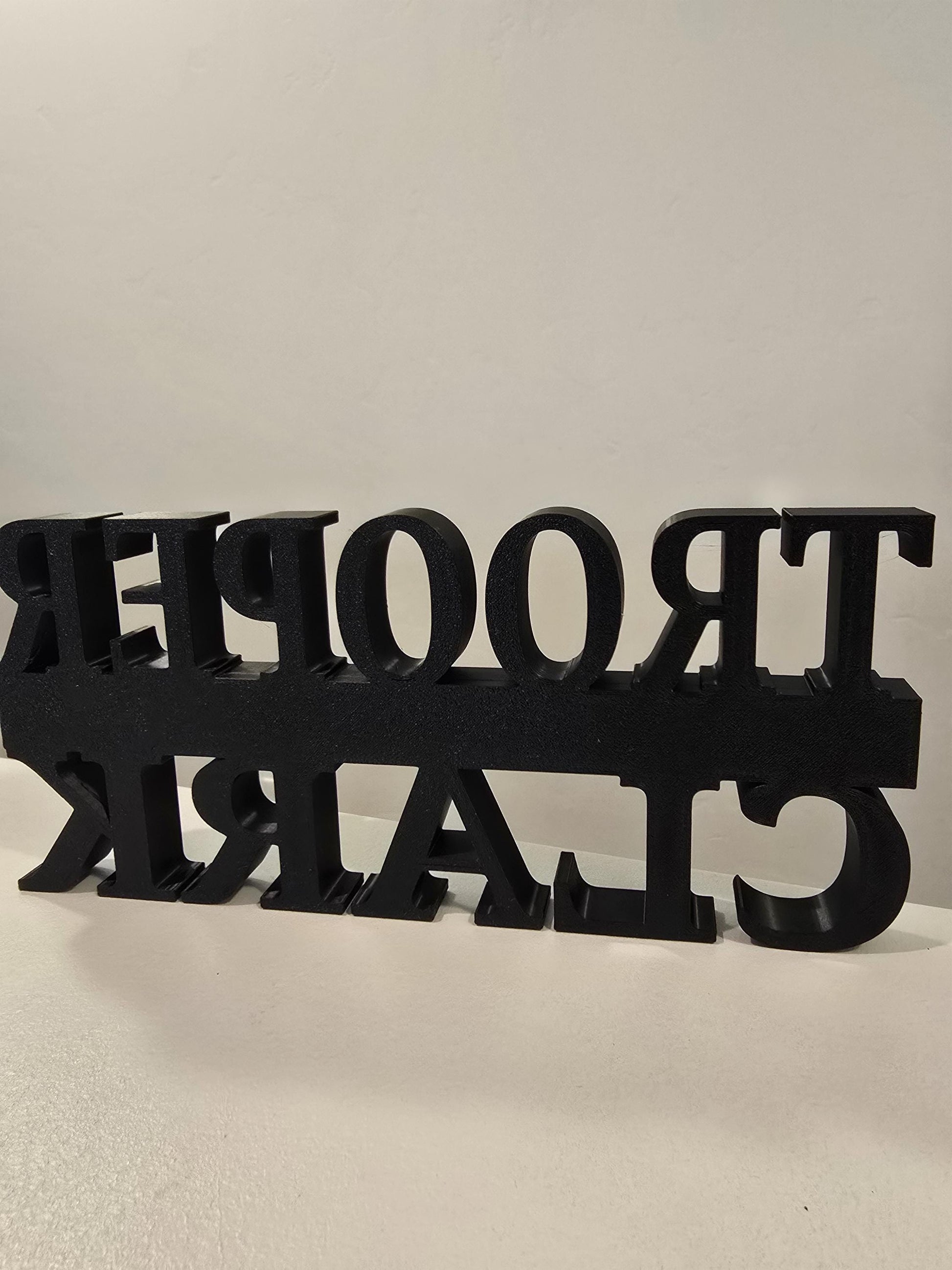 This is a cool 3D printed name plate made for desks at the office or at home. This is made out of strong PETG HF filament to ensure it does not deform or melt, staying strong and sturdy for years to come. I am able to do any custom rank or name you would like.